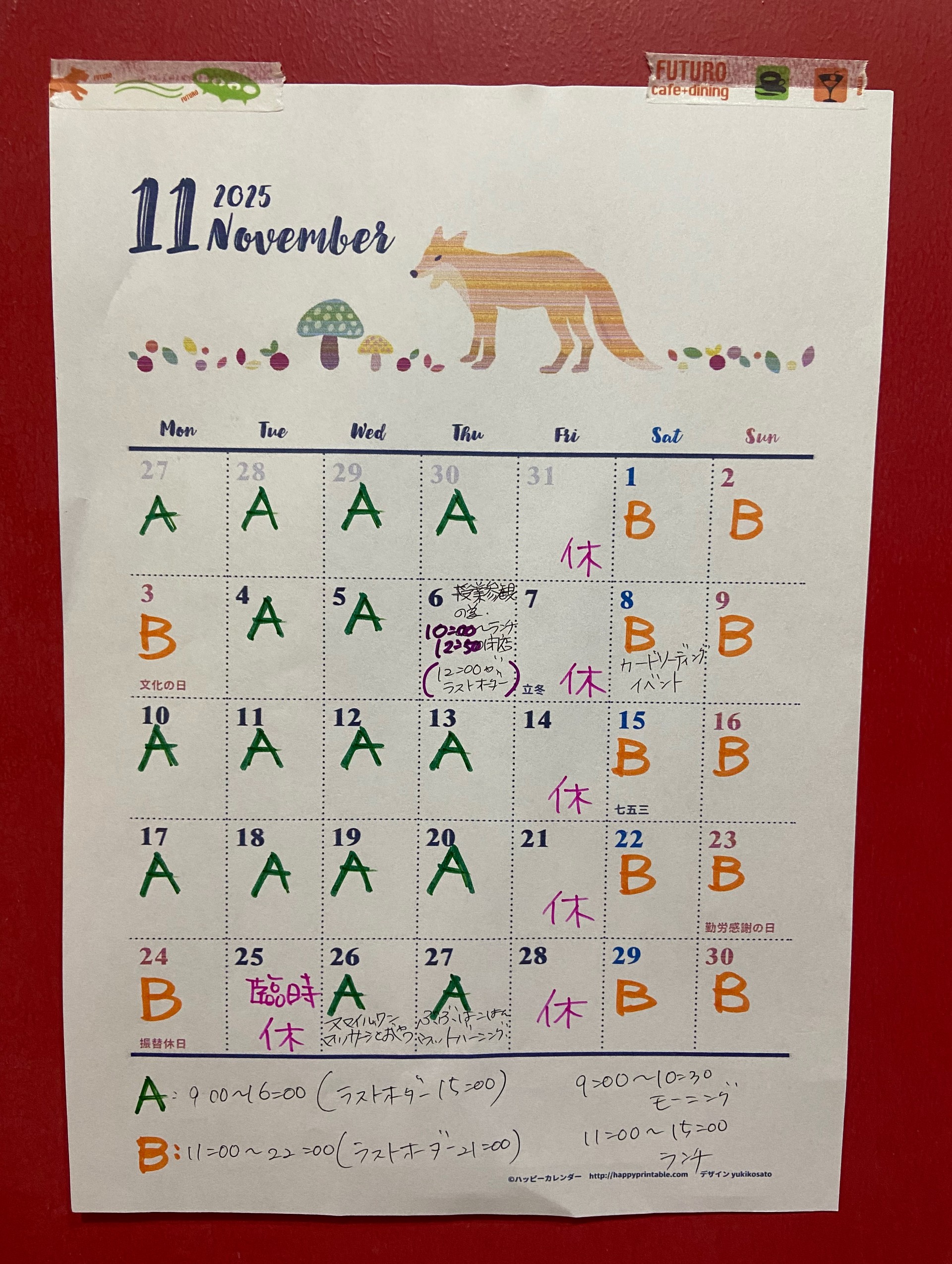 11/6 木曜 1限目次男授業参観5限目長男授業参観の為 10時からランチ営業12時ラストオーダー